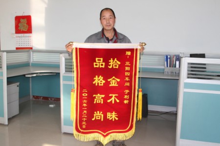 1月23日下午,于利新下班回家的路上,在路經(jīng)徐集村時,在村頭的路上撿到了一塊手機。當(dāng)他拿起手機時,想到手機的主人肯定非常著急,于是就想如何幫手機找到主人。因為這部手機的主人在手機中沒有存任何的電話聯(lián)系方式,于是他拿著手機去找到鄰居家的年輕人,讓人家通過手機上的QQ找到了手機的主人,當(dāng)手機的主人拿到失而復(fù)得的手機時,感謝之情溢于言表。失主為了表達謝意給他送去禮品表達謝意時,他拒絕了。于是失主將一面“拾金不昧,品格高尚”的錦旗送到車間。