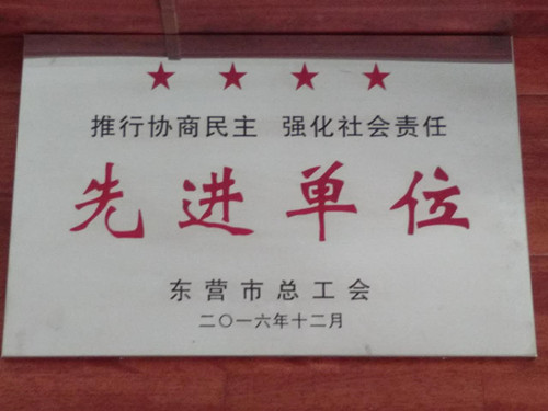 在市總工會(huì)開展的“推行協(xié)商民主、強(qiáng)化社會(huì)責(zé)任”工作品牌創(chuàng)建活動(dòng)中,我公司被東營(yíng)市總工會(huì)分別授予“東營(yíng)市推行協(xié)商民主強(qiáng)化社會(huì)責(zé)任先進(jìn)單位”、東營(yíng)市“五一”勞動(dòng)獎(jiǎng)狀榮譽(yù)稱號(hào)。公司代總經(jīng)理張堯宗榮獲東營(yíng)市“五一”勞動(dòng)獎(jiǎng)?wù)聵s譽(yù)稱號(hào)。