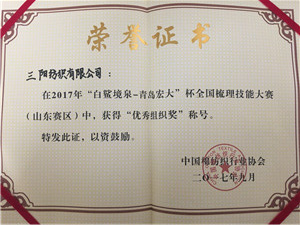 近日,公司組織企業(yè)員工參加2017年“白鯊境泉-青島宏大”杯全國(guó)梳理技能大賽(山東賽區(qū)),經(jīng)過(guò)激烈角逐,我公司獲得“優(yōu)秀組織獎(jiǎng)”稱(chēng)號(hào),我公司員工李永生、董建軍榮獲“梳棉技術(shù)拼搏能手”稱(chēng)號(hào)。本次大賽是對(duì)我公司員工操作技能水平的檢驗(yàn),同時(shí)也是我公司員工踐行“工匠精神”,對(duì)自身技能精益求精,勤學(xué)苦練的結(jié)果。