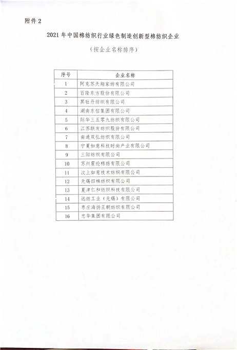 近日,我公司成功入選“2021年度中國棉紡織行業(yè)綠色制造創(chuàng)新型棉紡織企業(yè)”,我公司“粗紗吹吸風改造項目”和“細紗回送風風機變頻改造項目”成功入選第九批《中國棉紡織行業(yè)綠色制造技術(shù)暨創(chuàng)新應用目錄》。.jpg) .jpg)